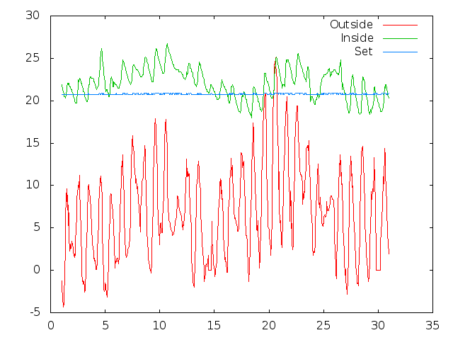 The Horizontal scale is the day numbers, vertical scale is the temperatures in degrees Celsius.