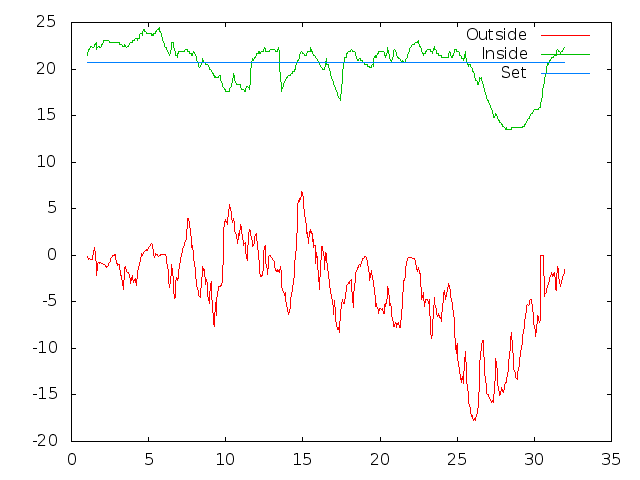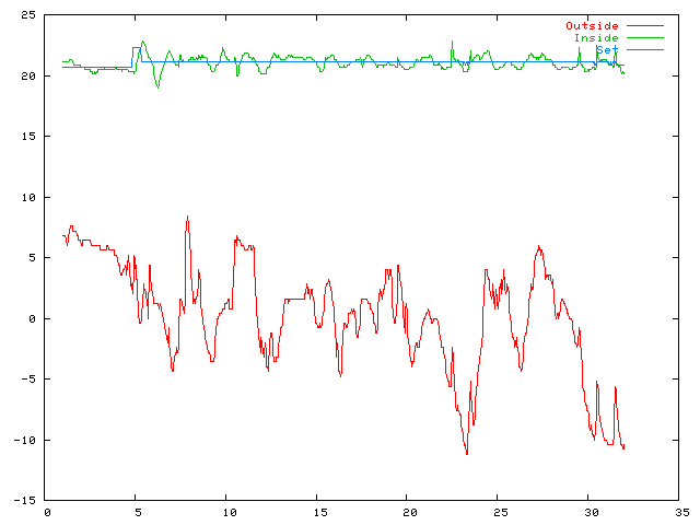 The Horizontal scale is the day numbers, vertical scale is the temperatures in degrees Celsius.